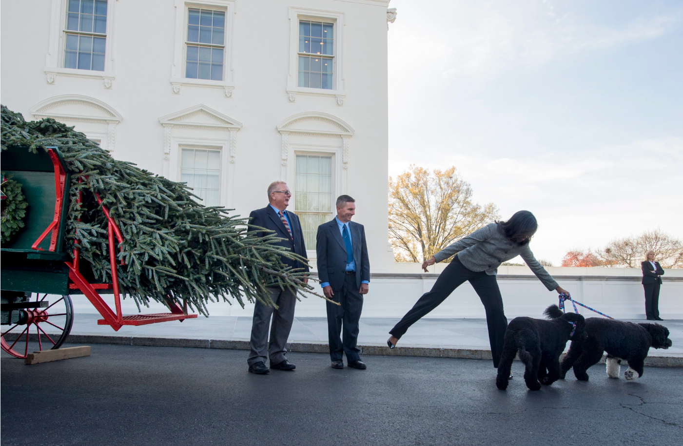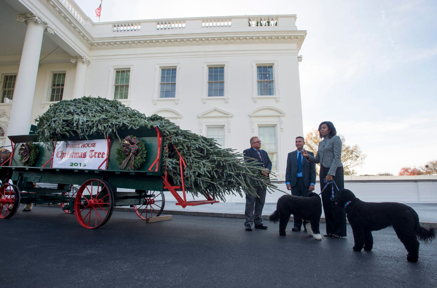 Όπως φαίνεται και στις φωτογραφίες η Πρώτη Κυρία των ΗΠΑ, Μισέλ Ομπάμα, “υποδέχθηκε” το Χριστουγεννιάτικο δέντρο, το οποίο έφθασε όπως κάθε χρόνο με κάρο. Η Μισέλ Ομπάμα είχε μαζί της τα δύο της σκυλιά, την Sunny και τον Bo, ενώ δεν μπορούσε να κρύψει τη χαρά της.