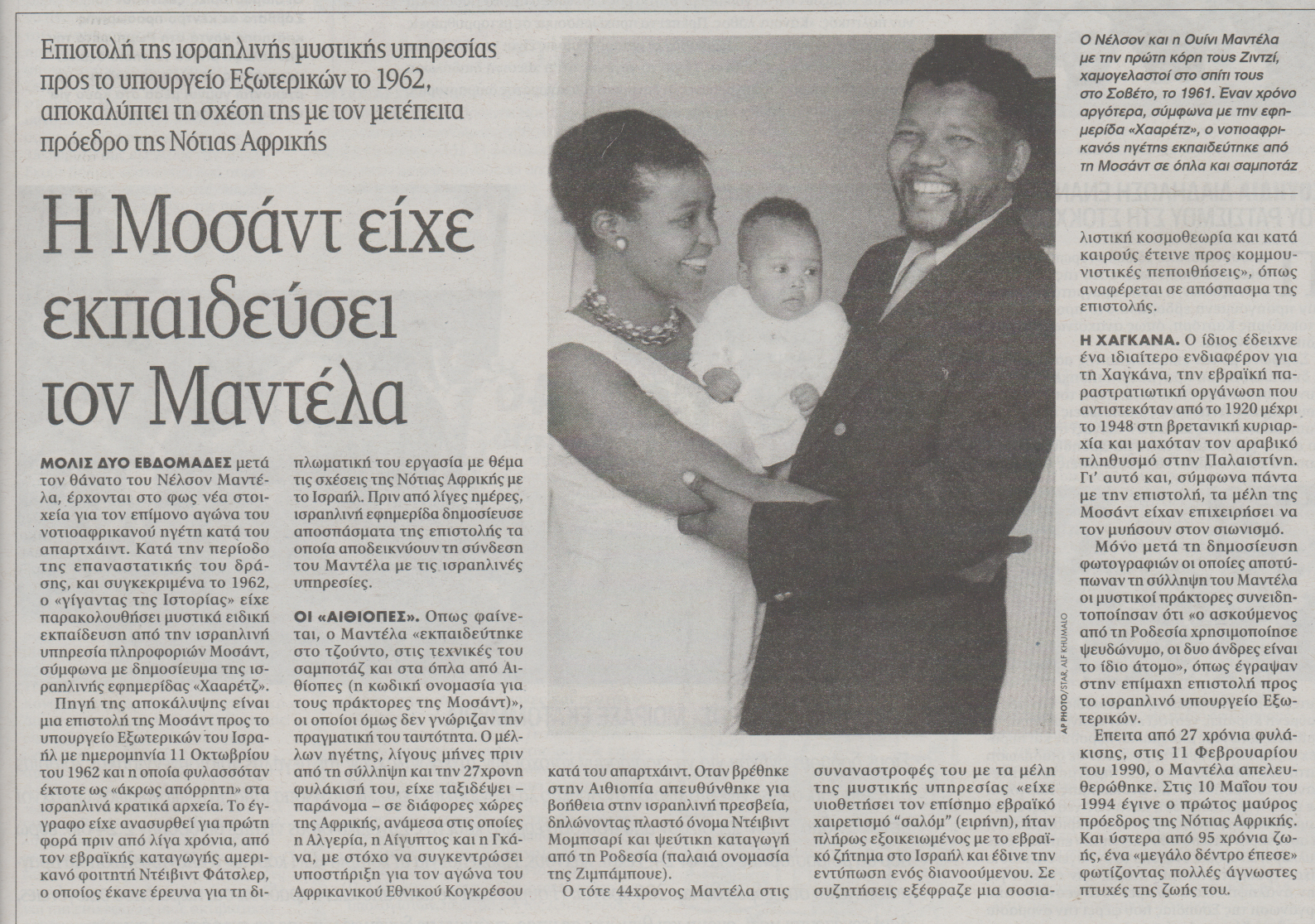 Μόλις δύο εβδομάδες μετά τον θάνατο του Νέλσον Μαντέλα, έρχονται στο φως νέα στοιχεία για τον επίμονο αγώνα του νοτιοαφρικανού ηγέτη κατά του απαρτχάιντ. Κατά την περίοδο της επαναστατικής του δράσης, και συγκεκριμένα το 1962, ο “γιγάντας της Ιστορίας” είχε παρακολουθήσει μυστικά ειδική εκπαίδευση από την ισραηλινή υπηρεσία πληροφοριών Μοσάντ, σύμφωνα με δημοσίευμα της ισραηλινής εφημερίδας “Χααρέτζ”.