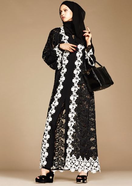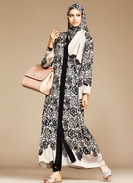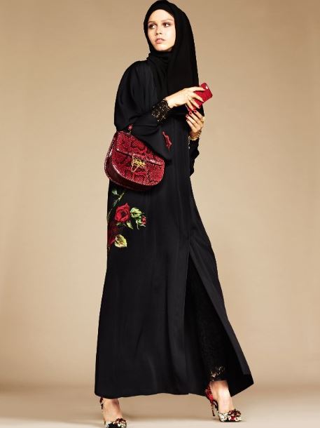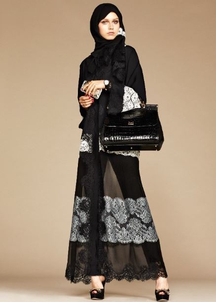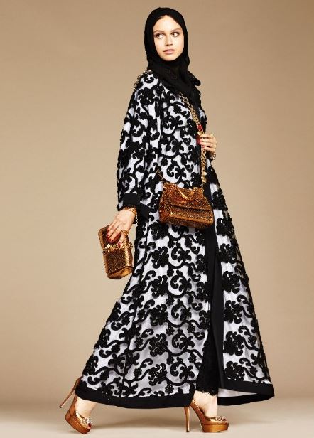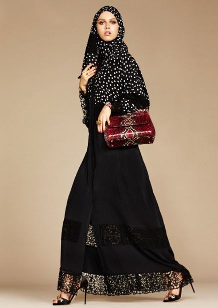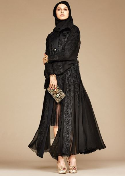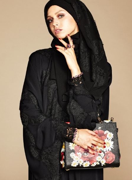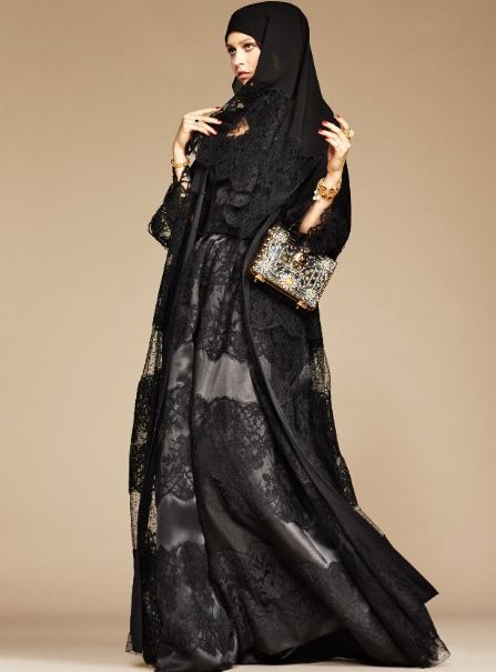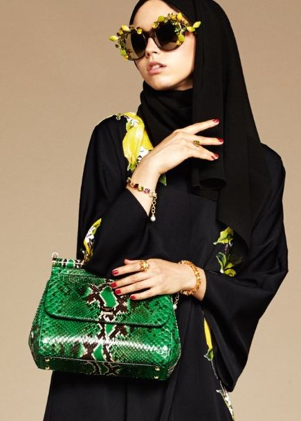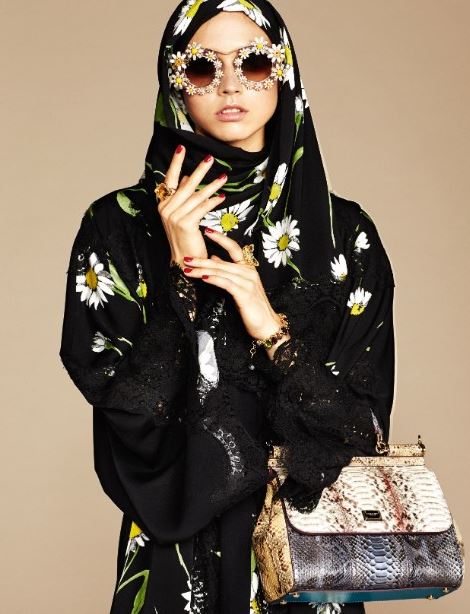 Μακριά από τα σέξι και εντυπωσιακά φορέματα, ο οίκος Dolce & Gabbana, δημιούργησε μία σειρά που απευθύνεται σε γυναίκες της Μέσης Ανατολής. Τα μοντέλα ποζάρουν με μαντίλα, την οποία συνδυάζουν με δαντέλα, μακριά φορέματα και ψηλοτάκουνα παπούτσια. Ξεχωριστή πινελιά που φέρνει κάτι από την Δύση οι πολύχρωμες τσάντες και  τα χρωματιστά γυαλιά.