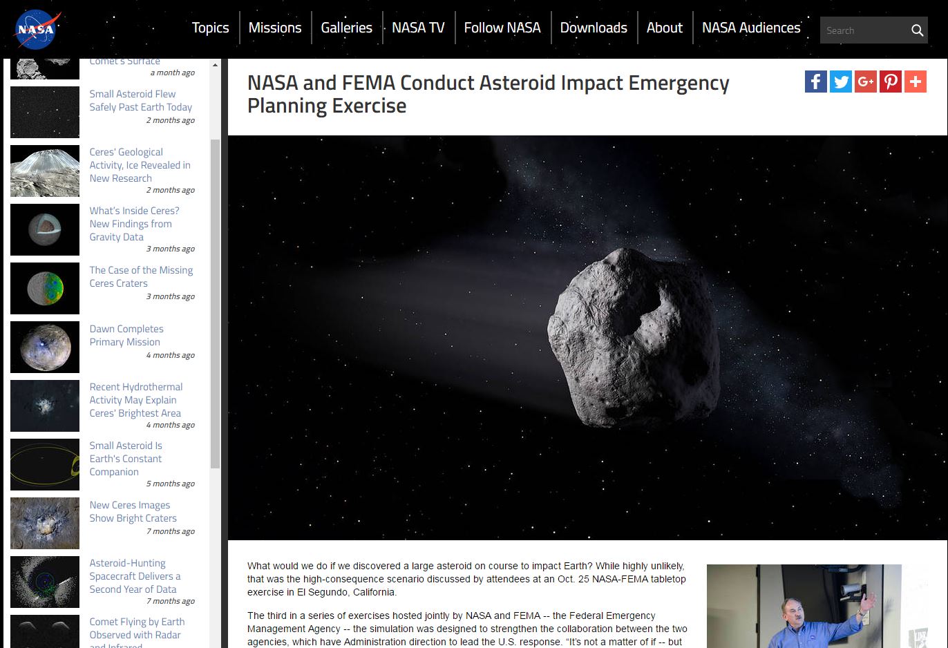 Αυτό ακριβώς ήταν το «σενάριο» της άσκησης επί χάρτου που διεξήγαγαν από κοινού στην Καλιφόρνια η Αμερικανική Διαστημική Υπηρεσία (NASA) και η Ομοσπονδιακή Υπηρεσία Αντιμετώπισης Καταστροφών (FEMA) των ΗΠΑ.