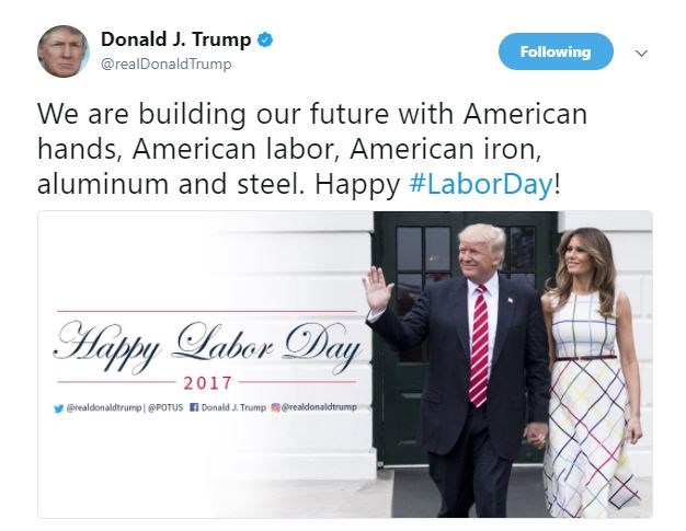 Αφορμή για το tweet του αποτέλεσε η Ημέρα της Εργασίας στις ΗΠΑ. Ο Αμερικανός Πρόεδρος έγραψε στην ανάρτησή του “χτίζουμε το μέλλον μας με αμερικανικά χέρια, αμερικανική εργασία, αμερικανικό σίδηρο, αλουμίνιο και ατσάλι”. Ωστόσο στη φωτογραφία που συνοδεύει το μήνυμα του απεικονίζεται η Πρώτη Κυρία των ΗΠΑ Μελάνια Τραμπ να φοράει φόρεμα από τη συλλογή της Ελληνίδας σχεδιάστριας Μαίρης Κατράντζου.