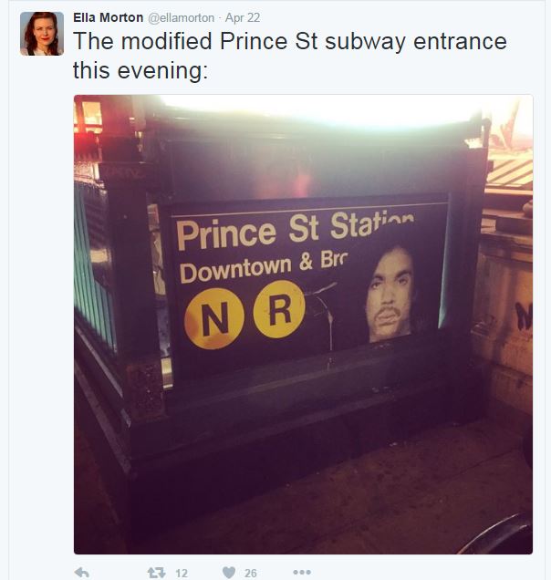 Το διάσημο ψηφιδωτό με το όνομα του δρόμου Prince St, τώρα αντί για το “St.” έχει δίπλα με κεφαλαία γράμματα ένα RIP για τον μουσικό που πέθανε σε ηλικία 57 ετών.
