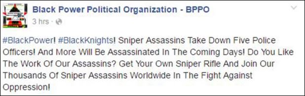 «Ελεύθεροι σκοπευτές σκότωσαν πέντε αστυνομικούς! Θα σκοτώσουμε περισσότερους τις επόμενες ημέρες. Σας αρέσει η δουλειά των εκτελεστών μας; Πάρε το δικό σου όπλο και μπες και εσυ στην ομάδα των χιλιάδων ελεύθερων σκοπευτών μας σε όλο τον κόσμο στην μάχη κατά της καταπίεσης», αναγράφεται σε ανάρτηση που έγινε στη σελίδα Black Power Political Organization, στο μέσο κοινωνικής δικτύωσης.