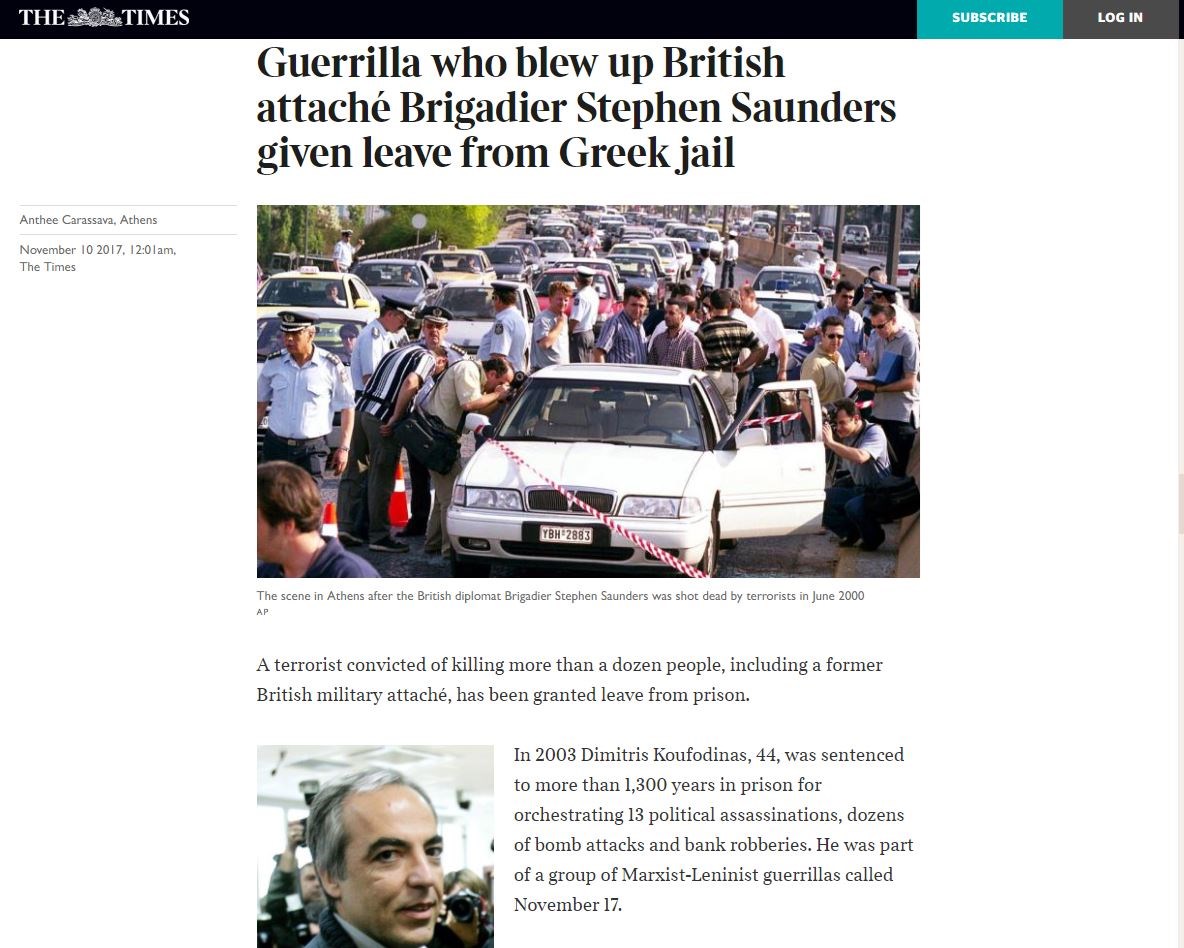 Τον αποτροπιασμό της για τη διήμερη άδεια του Δημήτρη Κουφοντίνα εκφράζει, με δήλωσή της, στην εφημερίδα Times του Λονδίνου η χήρα του Στίβεν Σόντερς, Χέθερ, λέγοντας μεταξύ άλλων πως «κανένα μέλος της 17 Νοέμβρη δεν έχει δείξει μεταμέλεια ή έχει ζητήσει συγγνώμη για την δολοφονία του συζύγου μου».
