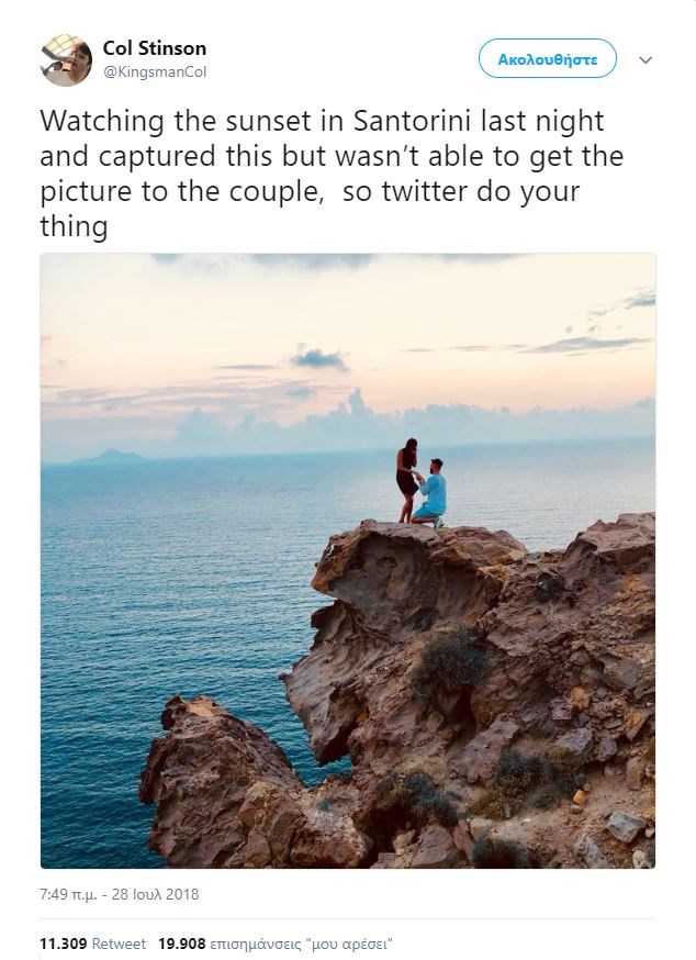 Συγκεκριμένα, στην εντυπωσιακή φωτογραφία βλέπουμε τον νεαρό άνδρα να γονατίζει μπροστά στη σύντροφό του και να κρατά το χέρι της. Το ζευγάρι βρισκόταν στην κορυφή ενός βράχου στο νησί, με θέα το Αιγαίο.