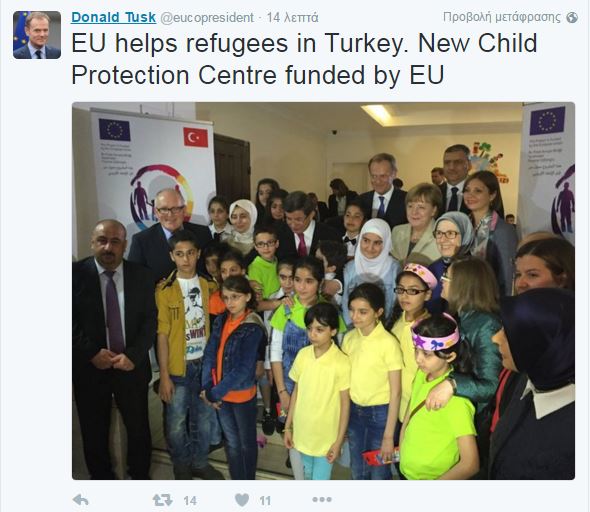 Ο κ. Τουσκ, συνοδευόμενος από την Άνγκελα Μέρκελ και τον Αχμέτ Νταβούτογλου, επισκέφτηκε ένα κέντρο προστασίας παιδιών προσφύγων, το οποίο χρηματοδοτήθηκε από την Ευρωπαϊκή Ένωση.