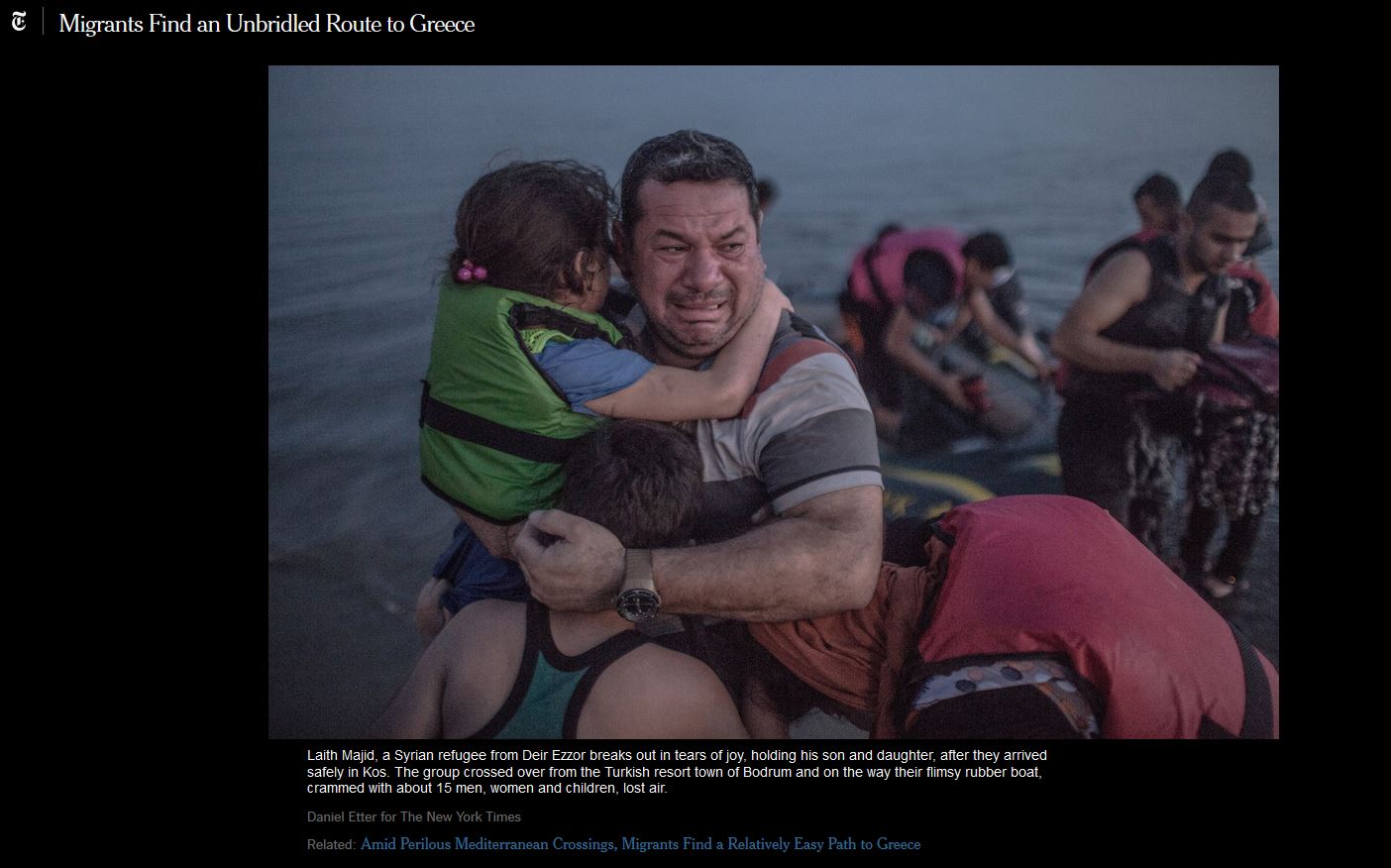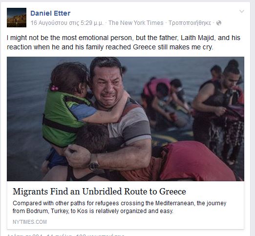 Ο 34χρονος φωτογράφος, Ντάνιελ Έτερ, έγραψε στον προσωπικό του λογαριασμό στο Facebook: «Μπορεί να μην είμαι ο πιο ευαίσθητος άνθρωπος, ωστόσο ο πατέρας, Λαΐθ Ματζίντ, και η αντίδρασή του όταν αυτός και η οικογένειά του έφτασαν στην Ελλάδα, με κάνουν ακόμη και τώρα να κλαίω».