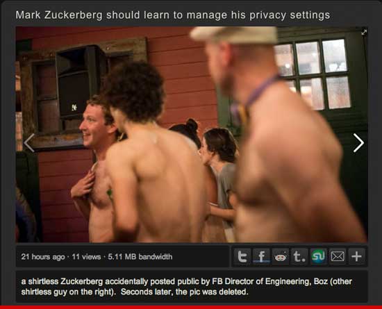 Η φωτογραφία τον δείχνει ημίγυμνο, ανάμεσα σε άλλους άνδρες, ενώ τα δημοσιεύματα, αφήνουν υπονοούμενα για την ιδιωτική του ζωή.Η φωτογραφία αν και έκανε την εμφάνισή της στο διαδίκτυο πριν από λίγη ώρα, δεν ξέρει κανένας πότε και που τραβήχτηκε.Τη συγκεκριμένη φωτογραφία, φέρεται να ανέβασε κατα λάθος στο ίντερνετ, ο Andrew Bosworth, o οποίος είναι Διευθυντής στο Τεχνικό τμήμα το Facebook.Κατέβασε τη φωτογραφία, λίγα δευτερόλεπτα αργότερα, αλλά ήταν ήδη αργά. Κάποιος την είχε δει, αποθηκεύσει και την ανέβασε ξανά.