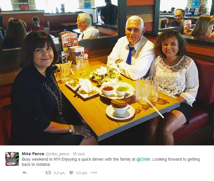 Στη φωτογραφία που ανέβασε ο Μάικ Πενς στον προσωπικό του λογαριασμό στο twitter εμφανίζεται να τρώει σε ένα εστιατόριο μαζί με τη γυναίκα και την κόρη του.