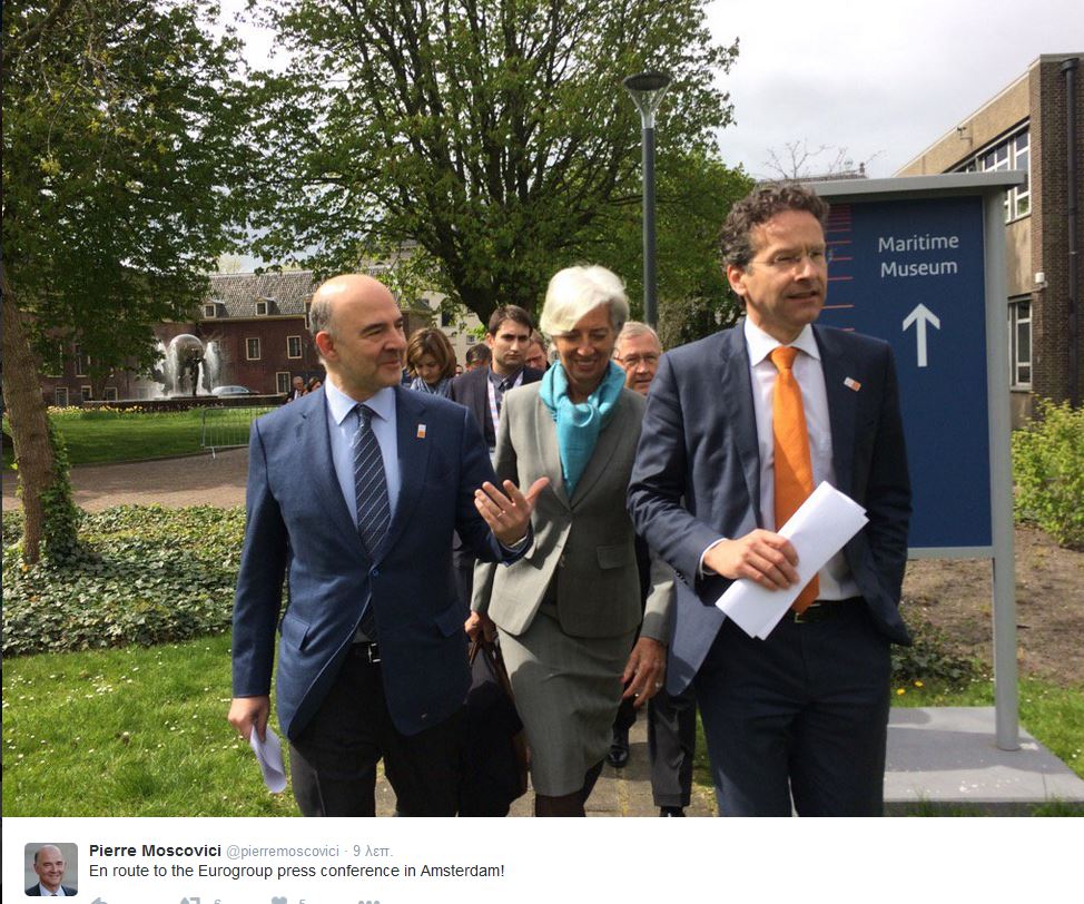 Στη φωτογραφία απεικονίζεται ο Πιέρ Μοσκοβισί, η Κριστίν Λαγκάρντ και ο Γερούν Ντάισελμπλούμ.