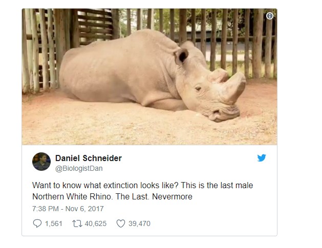 Ο Daniel Schneider, βιολόγος από τη Βοστώνη, ανήρτησε τη παρακάτω φωτογραφία στον προσωπικό του λογαριασμό στη δημοφιλή ιστοσελίδα κοινωνικής δικτύωσης γράφοντας: «Θέλετε να μάθετε πώς μοιάζει η εξαφάνιση; Αυτός είναι ο τελευταίος αρσενικός λευκός ρινόκερος. Ο τελευταίος. Δεν έχει άλλο».