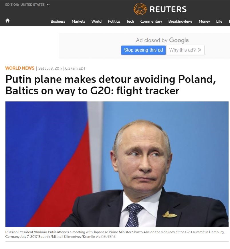 Το αεροσκάφος που μετέφερε τον Ρώσο Πρόεδρο Βλαντιμίρ Πούτιν στην διάσκεψη της ομάδας χωρών G20 στο Αμβούργο, έκανε παράκαμψη περίπου 500 χιλιομέτρων προκειμένου να αποφύγει να πετάξει στον εναέριο χώρο της Πολωνίας και των χωρών της Βαλτικής που είναι μέλη του ΝΑΤΟ, σύμφωνα με τα διαθέσιμα στοιχεία πτήσης (FlightRadar24 website).