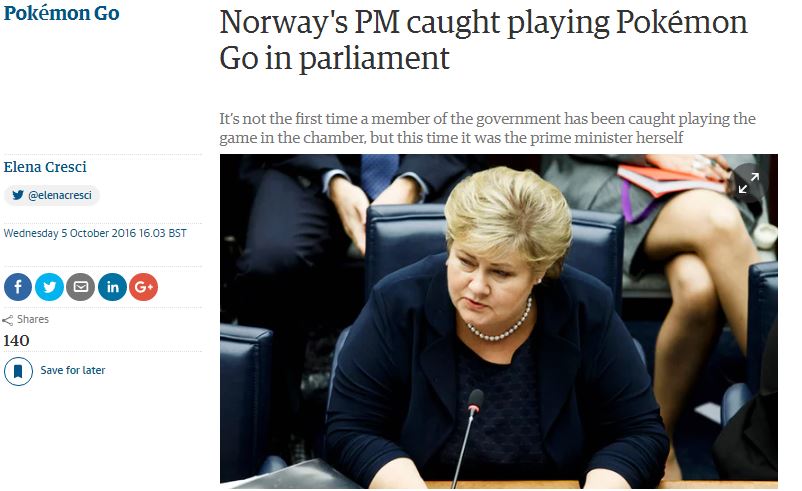 Όπως αναφέρει σε δημοσίευμα της η βρετανική εφημερίδα, η Πρωθυπουργός της Νορβηγίας είναι φανατική οπαδός του Pokemon Go. Κατά τη διάρκεια επίσημης επίσκεψης στην Σλοβακία είχε δηλώσει σε δημοσιογράφους ότι κατάφερε να βρει λίγο χρόνο για να παίξει το αγαπημένο της παιχνίδι.