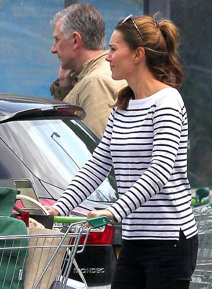 Η 31 χρονών Δούκισσα του Κέιμπριτζ, άφησε για λίγο το πρίγκιπα Γεώργιο στο σπίτι προκειμένου να κάνει τα ψώνια της σε τοπικό σουπερ μάρκετ. Ντυμένη απλά, με μια ριγέ ασπρόμαυρη μπλούζα και ένα μαύρο skinny παντελόνι, φλατ ανατομικές μπαλαρίνες και με πιασμένα τα μαλλιά της αλογοουρά, η Κέιτ έδειξε πόσο λεπτή και ωραία παραμένει μόλις ένα μήνα από την γέννηση του γιου της, ενώ έσερνε το καρότσι στο πάρκινγκ του καταστήματος.