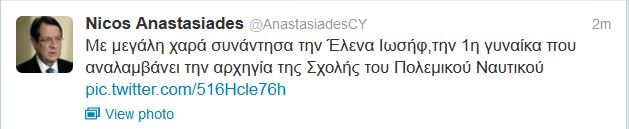 Ο Πρόεδρος της Κυπριακής Δημοκρατίας, Νίκος Αναστασιάδης ανέβασε νωρίτερα μια φωτογραφία, στον προσωπικό του λογαριασμό στο Twitter, με την πρώτη γυναίκα που αναλαμβάνει την αρχηγία της Σχολής του Πολεμικού Ναυτικού.