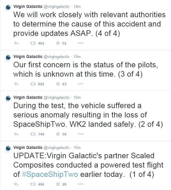 «Η πρώτη μας έννοια είναι η κατάσταση των πιλότων, την οποία δεν γνωρίζουμε αυτή τη στιγμή», ανέφερε πριν από λίγα λεπτά στον επίσημο λογαριασμό της η εταιρεία Virgin Galactic.