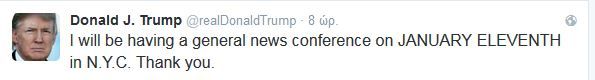Ο Ντόναλντ Τραμπ, εκλεγμένος πρόεδρος των ΗΠΑ θα παραχωρήσει μια συνέντευξη Τύπου την επόμενη εβδομάδα στη Νέα Υόρκη, σύμφωνα με το CNN. «Θα παραχωρήσω μία συνέντευξη Τύπου στις 11 Ιανουαρίου στη Νέα Υόρκη. Σας ευχαριστώ», ανέφερε ο ίδιος σε ανάρτησή του στο Twitter.