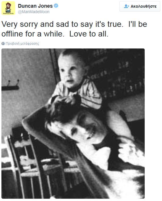Ο σκηνοθέτης και σεναριογράφος Duncan Jones, γιος του David Bowie και της Angela Barnett, ανακοίνωσε μέσω Twitter τη λύπη του για το θάνατο του πατέρα του.