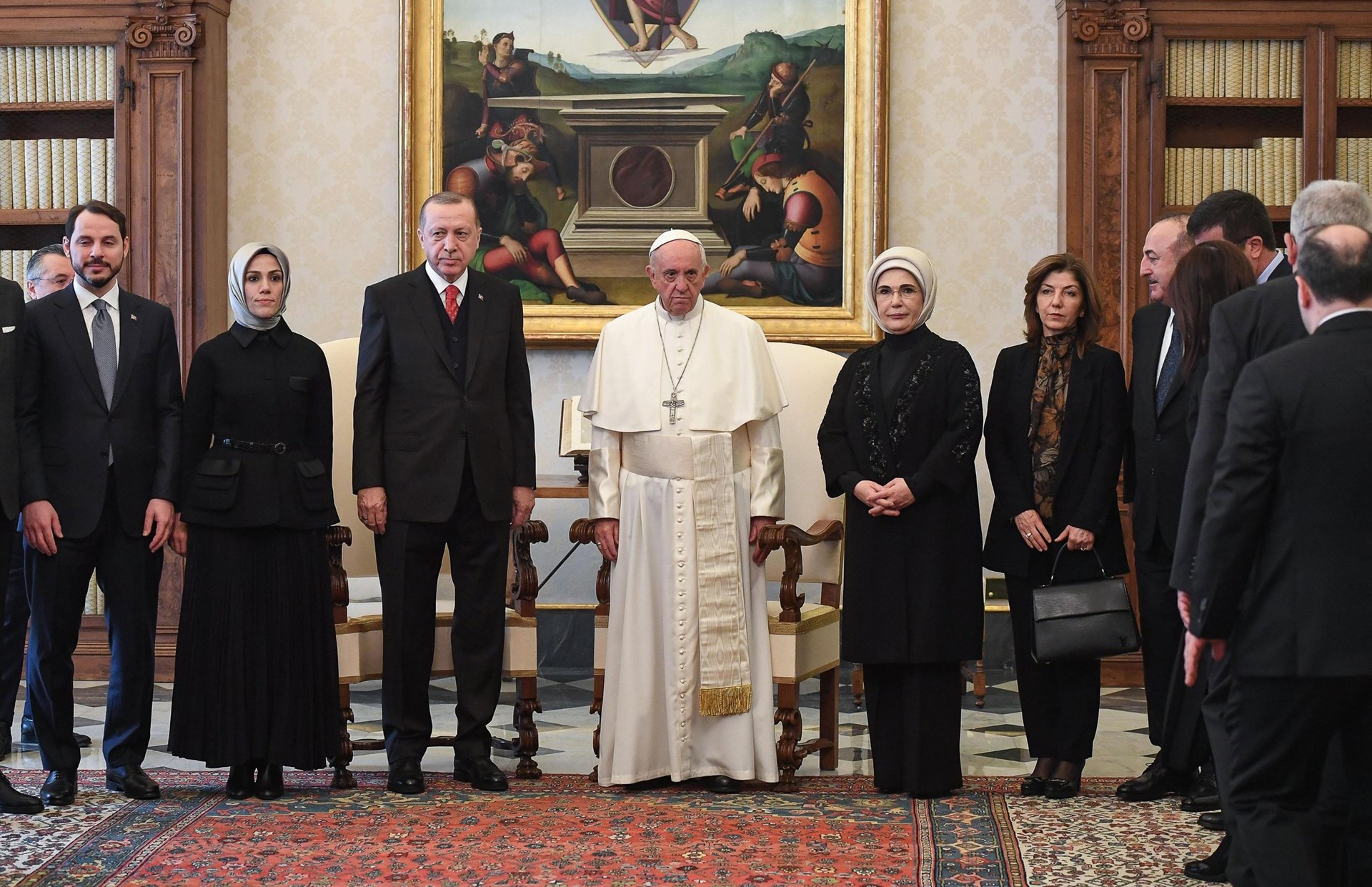 Πενήντα λεπτά διήρκεσε η συνάντηση του Πάπα Φραγκίσκου με τον Τούρκο Πρόεδρο Ρετζέπ Ταγίπ Ερντογάν, στην βιβλιοθήκη του Βατικανού. Τον Πρόεδρο της Τουρκίας συνόδευαν, μεταξύ άλλων, η σύζυγός του Εμινέ, η κόρη του Έσρα, και πέντε υπουργοί της τουρκικής κυβέρνησης.