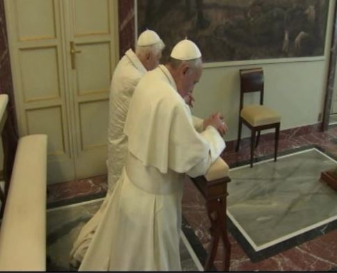 Στη συνέχεια έφτασαν στα διαμερίσματα και απομονώθηκαν στο περεκκλήσι για να πρoσευχηθούν οι δυο τους. Εκεί ο επίτιμος πάπας του πρόσφερε την τιμιτική θέση, αλλά εκείνος αρνήθηκε λέγοντάς του ότι “Είμαστε αδέρφια” και τον προσκάλεσε να καθίσουν μαζί και να προσευχηθούν.