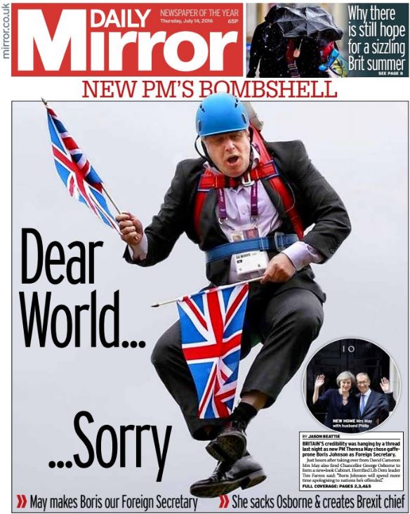 «Συγνώμη αγαπητέ κόσμε», γράφει στο πρωτοσέλιδό της η βρετανική εφημερίδα “Daily Mirror“, σχολιάζοντας την επιλογή της νέας πρωθυπουργού της Βρετανίας, Τερέζα Μέι, να αναθέσει την βρετανική διπλωματία στα χέρια του Μπόρις Τζόνσον, πρώην δημάρχου του Λονδίνου και ενός εκ των ηγετών υπέρ του Brexit.