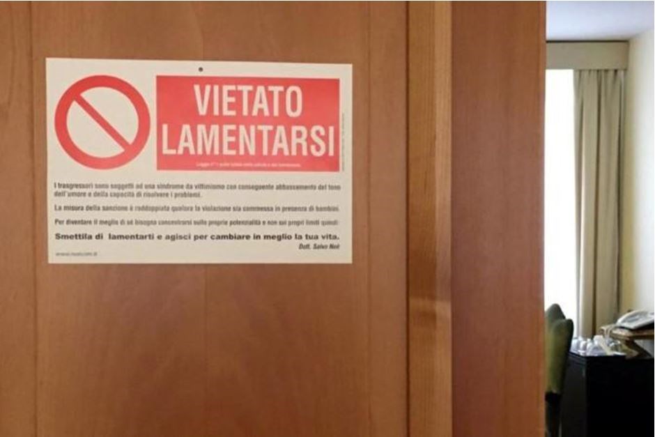 Η σαφής οδηγία είναι γραμμένη στα ιταλικά με λευκά και κόκκινα γράμματα και αναφέρει ότι “οι παραβάτες πάσχουν από ένα σύνδρομο που τους κάνει να αισθάνονται διαρκώς θύματα και ως αποτέλεσμα χάνουν την αίσθηση του χιούμορ τους και την ικανότητά τους να λύνουν τα προβλήματά τους”.