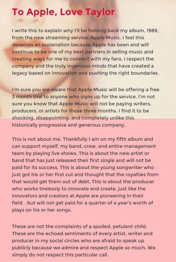 Σε ανοικτή επιστολή που απέστειλε προς την Apple, η Σουίφτ ανακοίνωσε ότι δεν θα παραχωρούσε στην εταιρεία το δικαίωμα να διαθέσει το δημοφιλέστατο άλμπουμ της, καθώς, όπως υποστηρίζει, ήταν ιδιαίτερα δυσαρεστημένη με την τρίμηνη δωρεάν δοκιμή που προσφέρεται στους συνδρομητές οι οποίοι θα εγγράφονται για πρώτη φορά στην υπηρεσία.