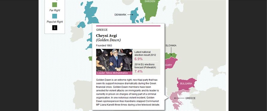 Καθώς οι ευρωεκλογές πλησιάζουν, τα ακροδεξιά κόμματα, όπως το FNP της Μαρίν Λεπέν, σχεδιάζουν ένα πολιτικό μπλοκ που θα μπορούσε να έχει μία μόνιμη επίπτωση στην ευρωπαϊκή ήπειρο, αναφέρει το δημοσίευμα και συνεχίζει: Κάποια κόμματα, όπως η Χρυσή Αυγή είναι πολύ ακραία για να μετέχουν σε αυτό. Άλλα, όπως το UKIP είναι ποιο “απρόθυμα” όσον αφορά τη συσχέτηση τους με την άκρα δεξιά.