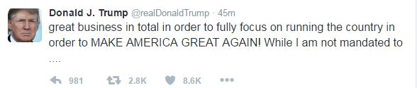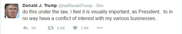 Όπως ανέφερε σε ανάρτησή του στον λογαριασμό του στο Twitter ανέφερε ότι δεν είναι υποχρεωμένος να κόψει τους δεσμούς του με τις επιχειρήσεις του, όμως ο ίδιος αισθάνεται ότι είναι «σημαντικό για να τηρηθούν τα προσχήματα» ως Πρόεδρος να μην φαίνεται ότι υπάρχει σύγκρουση συμφερόντων με τις επιχειρήσεις του.