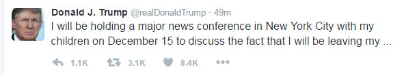 Ο εκλεγμένος Πρόεδρος των ΗΠΑ Ντόναλντ Τραμπ ανακοίνωσε ότι θα αποχωρήσει από τις επιχειρήσεις του για να επικεντρωθεί στη διακυβέρνηση της χώρας και πρόσθεσε ότι θα παρουσιάσει το σχέδιό του στη διάρκεια συνέντευξης Τύπου στις 15 Δεκεμβρίου στην οποία θα είναι παρούσα και η οικογένειά του.