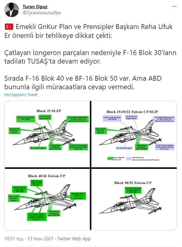 Ωστόσο, το πρόβλημα υφίσταται με τα νεότερης γενιάς Block 40 & 50, όπου επίσης έχουν διαπιστωθεί προβλήματα ρωγμών. Όπως μάλιστα αναφέρεται έχει ζητηθεί συνδρομή από τις Ηνωμένες Πολιτείες, για την αντιμετώπιση των δομικών προβλημάτων, χωρίς ωστόσο να έχουν λάβει την παραμικρή απόκριση στα αιτήματά τους. Παρόλα αυτά εκφράζεται η αισιοδοξία ότι θα μπορέσουν να ξεπεράσουν τα προβλήματα με την εγχώρια βιομηχανία να αναλαμβάνει το δύσκολο πρόγραμμα συντήρησής τους. Όπως έχουμε γράψει στο enikos.gr πρόσφατα, οι Τούρκοι ισχυρίζονται ότι θα μπορέσουν να αναβαθμίσουν τα συνολικά 245 μαχητικά του τύπου που διαθέτουν, με εγχώριας ανάπτυξης ηλεκτρονικά συστήματα και πυραύλους, αμφιβόλου κατά πολλούς αποτελεσματικότητας.