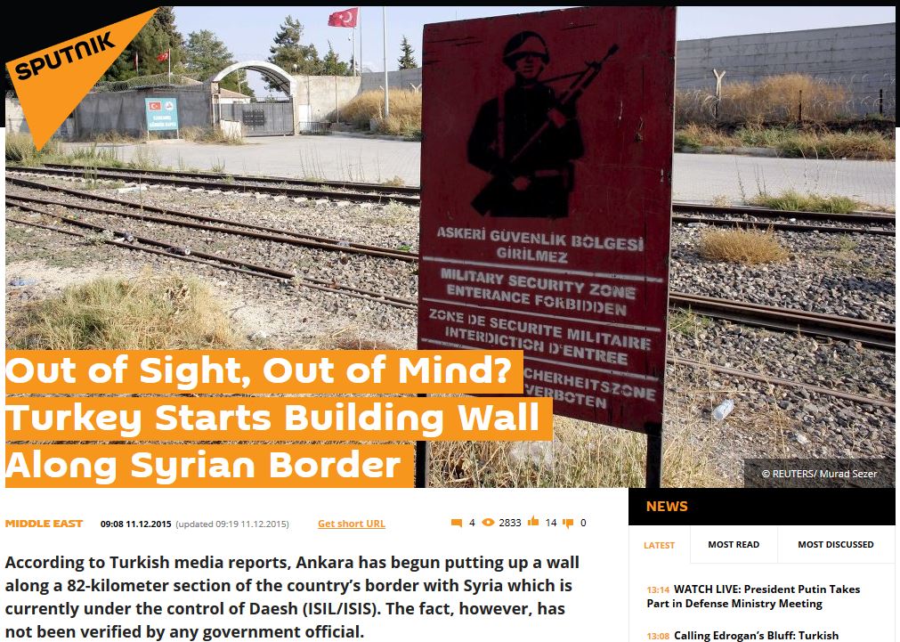 Για το ρωσικό πρακτορείο “Sputnik”, η κατασκευή του φράχτη αποτελεί μία ριζοσπαστική απάντηση της Τουρκίας στις πιέσεις των ΗΠΑ να κάνει η Άγκυρα περισσότερα για να σταματήσει το πέρασμα των τζιχαντιστών από την Συρία στο τουρκικό έδαφος.
