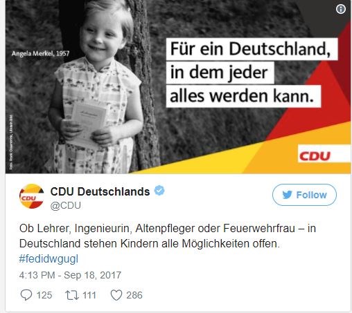 «Δασκάλα, μηχανικός, νοσοκόμα ή πυροσβέστης, στη Γερμανία τα παιδιά μπορούν να γίνουν ό,τι θέλουν», σημειώνεται στην ανάρτηση του CDU στο Twitter. Δείτε την ανάρτηση: