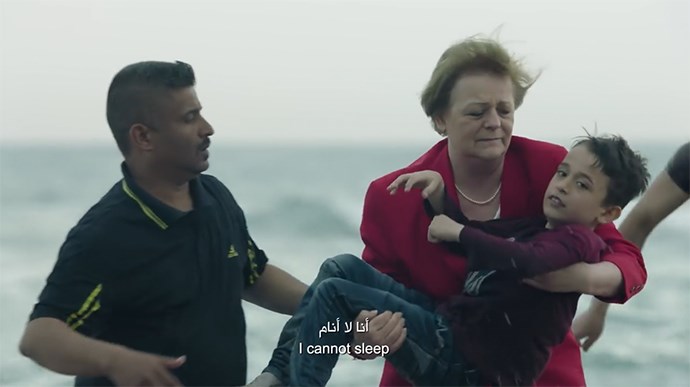 Μια ομάδα Σύριων προσφύγων θαλασσοδέρνεται και κινδυνεύει να πνιγεί, ενώ προσπαθεί να φθάσει στα παράλια κάποιου ελληνικού νησιού. Ο Πρωθυπουργός του Καναδά και η Καγκελάριος της Γερμανίας σπεύδουν να βοηθήσουν ηλικιωμένους, νέους και παιδιά, με την Άνγκελα Μέρκελ να βγάζει από το νερό στην αγκαλιά της ένα μικρό αγόρι.