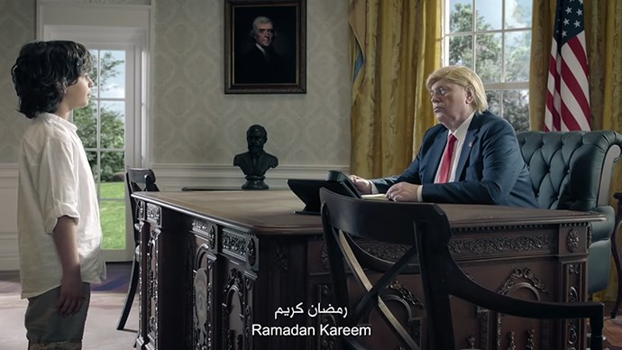 Το βίντεο ξεκινά με τον μικρό μουσουλμάνο να μπαίνει στο Οβάλ Γραφείο, στον Λευκό Οίκο και αντικρίζοντας τον Πρόεδρο των ΗΠΑ να του εύχεται «χαρούμενο Ραμαζάνι», προσκαλώντας τον να φάνε ιφταρ και ζητώντας του, αν μπορεί, να βρει το σπίτι του κάτω από τα συντρίμμια.