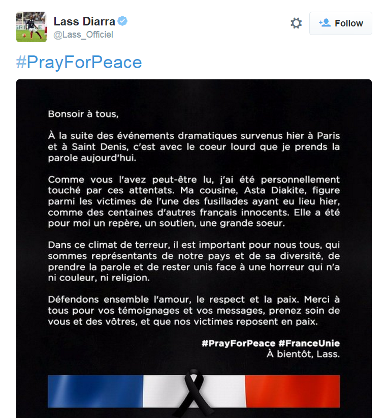 Ο 30χρονος ποδοσφαιριστής γνωστοποίησε την απώλεια της Ντιακιτέ μέσω του λογαριασμού του στο twitter. «Όπως ίσως έχετε διαβάσει, έχω επηρεαστεί προσωπικά από αυτές τις επιθέσεις. Η ξαδέλφη μου, Αστα Ντιακιτέ, είναι ανάμεσα στα θύματα μίας εκ των επιθέσεων με πυροβολισμούς που συνέβησαν στο Παρίσι, όπως και εκατοντάδες άλλοι αθώοι Γάλλοι πολίτες. Για μένα υπήρξε μεγάλος οδηγός, στήριγμα, μία μεγάλη αδελφή» έγραψε μεταξύ άλλων.