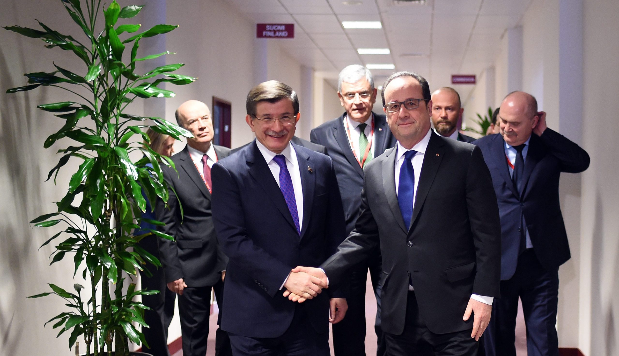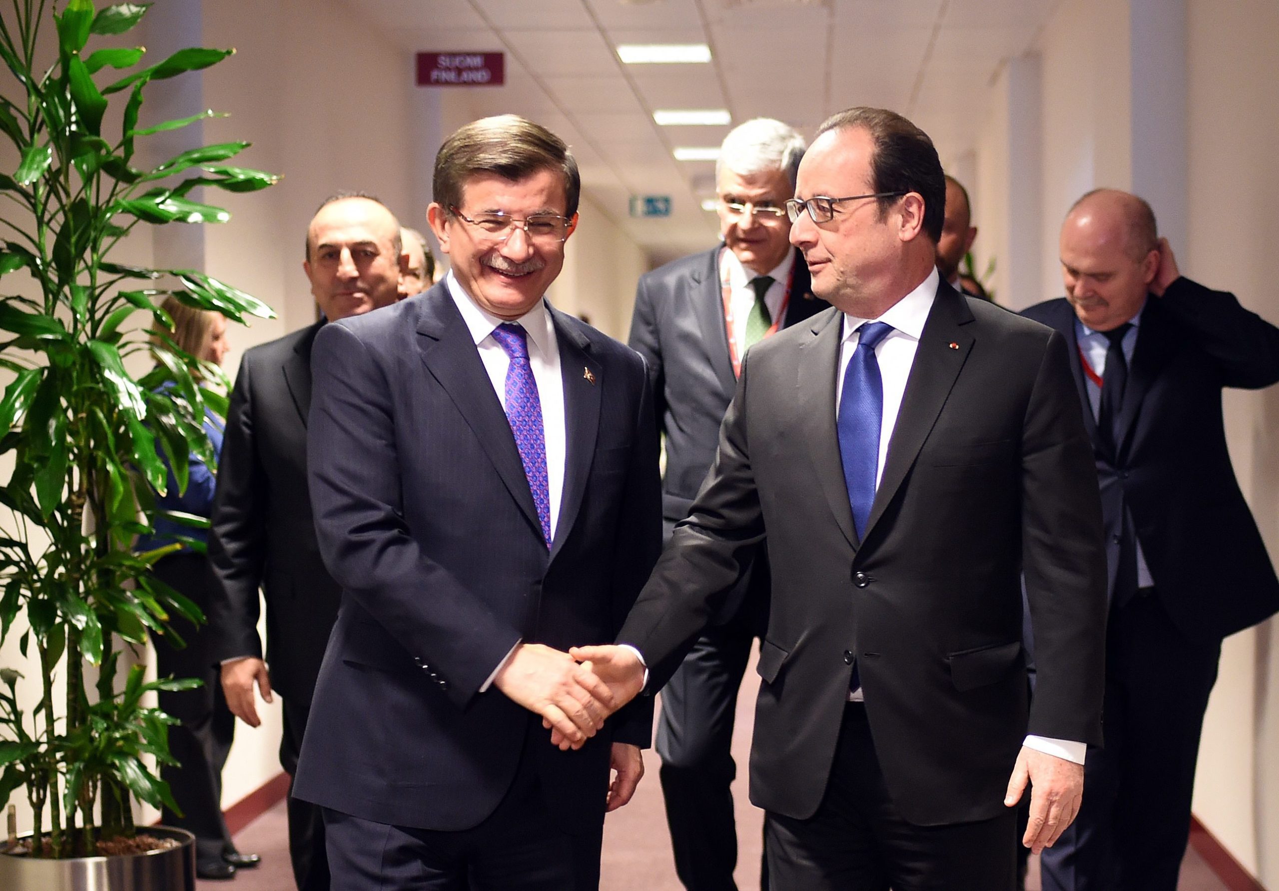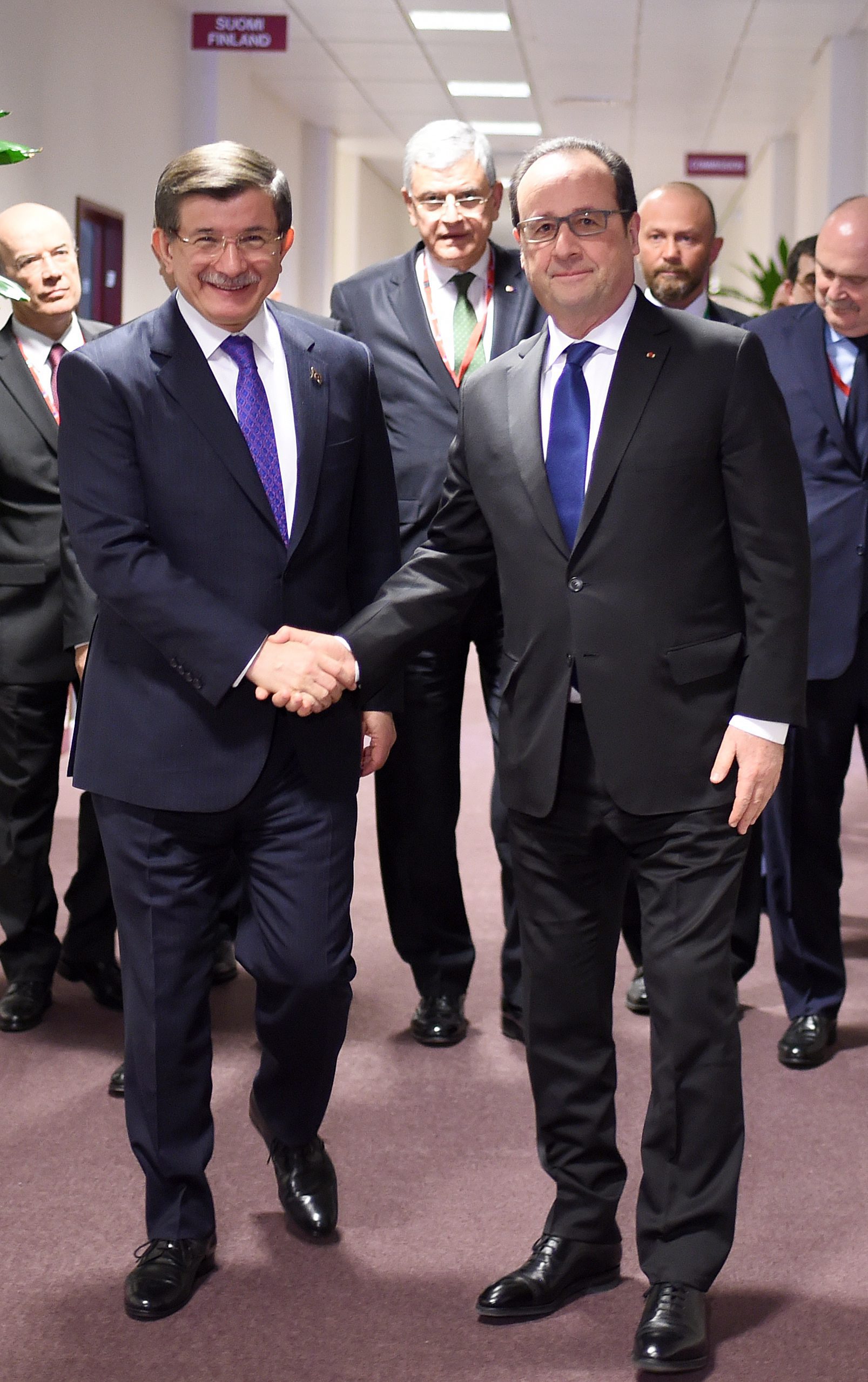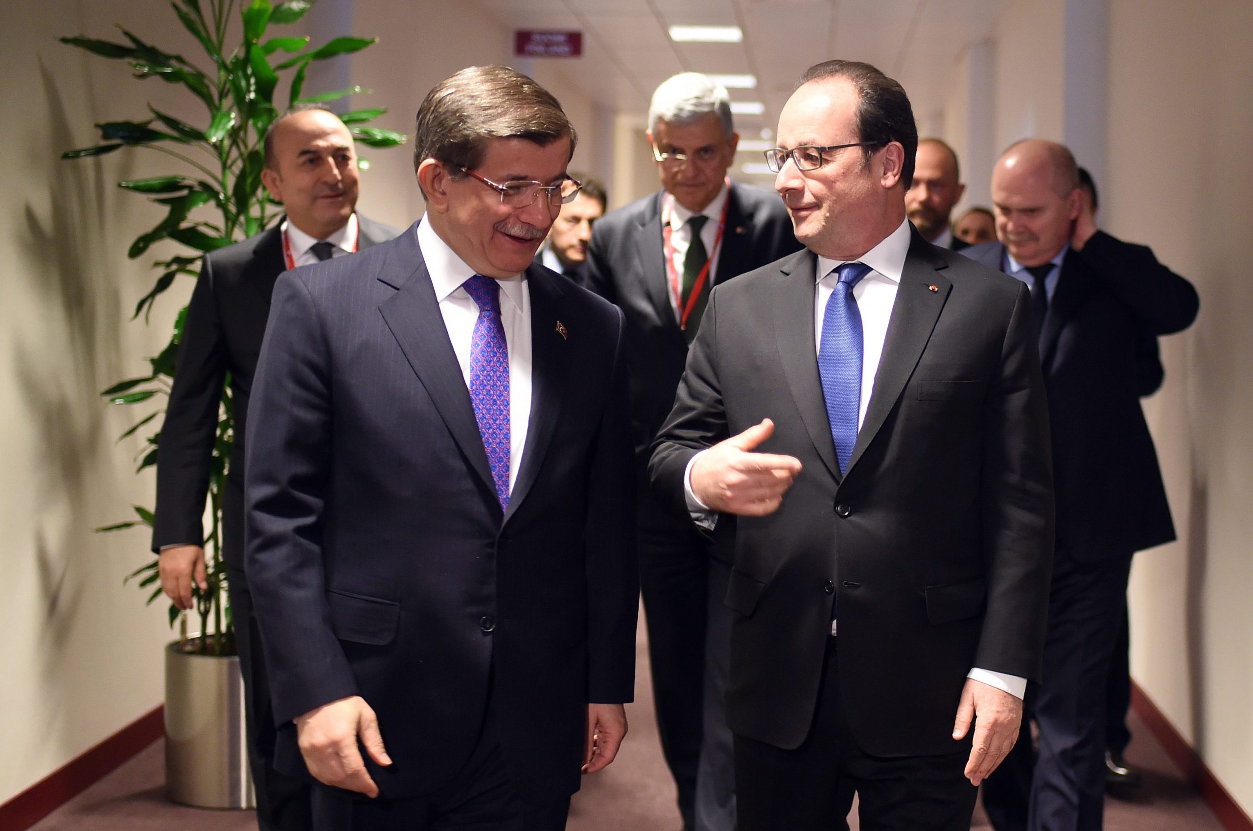 Ο πρόεδρος της Γαλλίας Φρανσουά Ολάντ συνόδευσε τον Τούρκο Πρωθυπουργό, Αχμέτ Νταβούτογλου στην αίθουσα της Συνόδου Κορυφής.