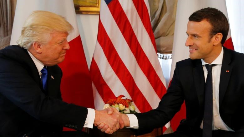 «Είμαι πολύ ευτυχής και από την πλευρά μου που είμαι με τον πρόεδρο Τραμπ», απάντησε ο Εμμανουέλ Μακρόν, αναφέροντας από τα θέματα της ημερήσιας διάταξης τον αγώνα κατά της τρομοκρατίας και «τα κλιματικά και ενεργειακά ζητήματα».