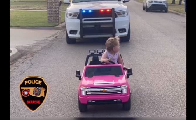 Ένα ξεκαρδιστικό βίντεο που κοινοποιήθηκε από το Αστυνομικό Τμήμα της Okarche δείχνει την Rose Fern να παραβιάζει τον νόμο καθώς την σταματούν οι αστυνομικοί, ενώ οδηγούσε ανέμελη το ροζ, μίνι αυτοκίνητό της που λειτουργεί με μπαταρία.