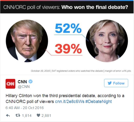 Με ποσοστό 52% η Χίλαρι Κλίντον κέρδισε τις εντυπώσεις στο τρίτο και τελευταίο ντιμπέιτ.