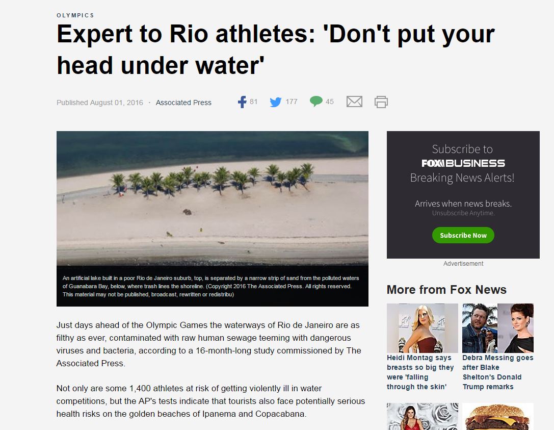 Σύμφωνα με έρευνα για λογαριασμό του Associated Press, που διήρκεσε 16 μήνες, οι αθλητές διατρέχουν σοβαρό κίνδυνο ασθενειών και τους καλούν να μη βάλουν το κεφάλι τους μέσα στα νερά της βραζιλιάνικης μεγαλούπολης.