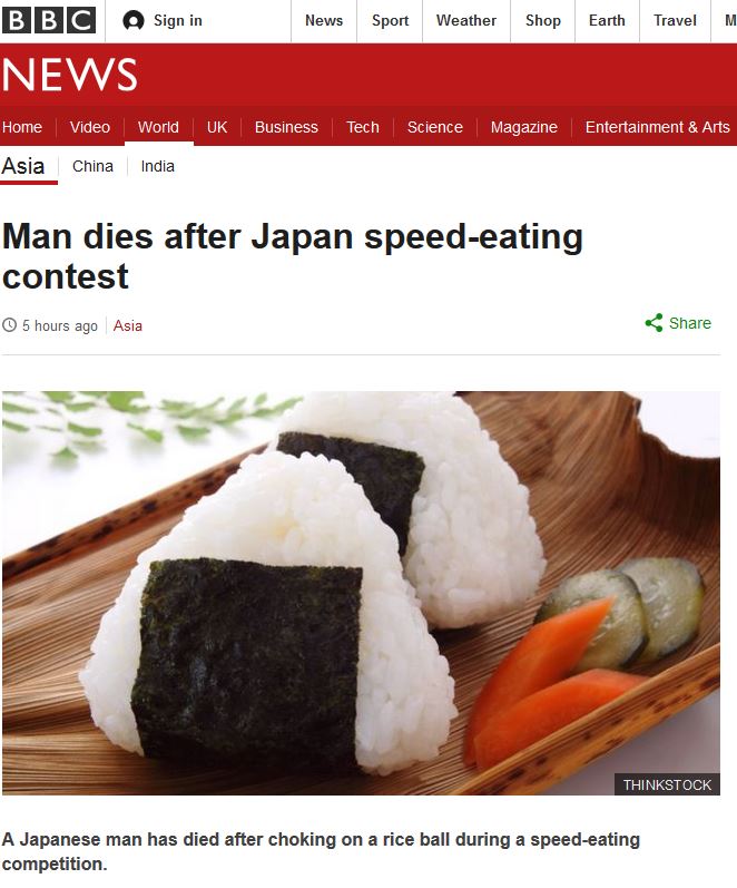 Σύμφωνα με το BBC, ο άνδρας που έχασε τις αισθήσεις του, έπρεπε να φάει πέντε onigiri balls μέσα σε μόλις τρία λεπτά, αλλά ένα μπαλάκι ρυζιού στάθηκε μοιραίο για εκείνον.