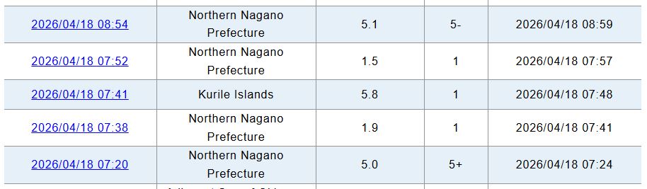Το Σάββατο, γύρω στις 13:20 τοπική ώρα, σεισμός 5 Ρίχτερ συγκλόνισε το βόρειο τμήμα του νομού. Στην ιαπωνική κλίμακα σεισμικής έντασης (0 έως 7), οι πόλεις Ομάτσι και Ναγκάνο κατέγραψαν εντάσεις «άνω του 5» και «κάτω του 5» αντίστοιχα.