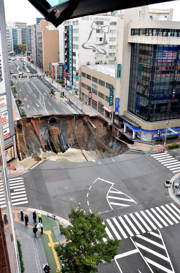 Η τεράστια τρύπα που δημιουργήθηκε στο κέντρο της ιαπωνικής πόλης, “κατάπιε” πεζοδρόμια και φανάρια, χωρίς όμως ευτυχώς να τραυματιστεί κανείς.