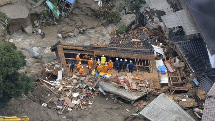 Έπειτα από μια εβδομάδα συνηθισμένων βροχών, «οι μεγαλύτερες» κατακρημνίσεις που «έχουν καταγραφεί ποτέ» στην περιοχή, σύμφωνα με την ιαπωνική εθνική μετεωρολογική υπηρεσία, προκάλεσαν την υπερχείλιση ποταμών και κατολισθήσεις. Ηλικιωμένη 77 ετών σκοτώθηκε όταν κατολίσθηση χτύπησε το σπίτι της στη Σαγκά τη νύχτα της Κυριακής προς Δευτέρα. Ο σύζυγός της ανασύρθηκε ζωντανός από πυροσβέστες και διακομίστηκε σε νοσοκομείο.