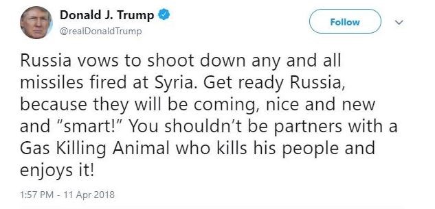 “Η Ρωσία δεσμεύεται να καταρρίψει όλους τους πυραύλους που θα εκτοξευθούν προς τη Συρία. Ετοιμάσου Ρωσία, επειδή θα έρθουν, είναι νέοι και ‘έξυπνοι’. Η Ρωσία δεν πρέπει να είναι εταίρος με ένα κτήνος που σκοτώνει τον λαό του με αέριο και το απολαμβάνει!”, έγραψε στην αναάρτηση του ο Τραμπ.