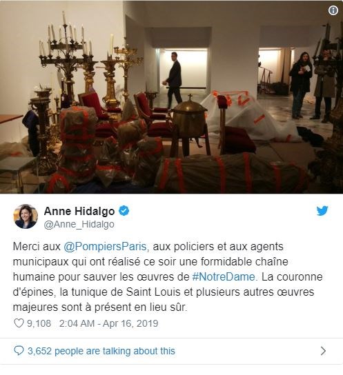 Η δήμαρχος του Παρισιού, Άν Ινταλγκό ανέβασε μία φωτογραφία στο Twitter και είπε ότι αστυνομικοί και διασώστες σχημάτισαν «ανθρώπινη αλυσίδα» για να σώσουν τα έργα τέχνης και τα θρησκευτικά κειμήλια, μεταξύ των οποίων το Ακάνθινο Στεφάνι και ο χιτώνας του Αγίου Λουδοβίκου.«Το “Ακάνθινο Στεφάνι”, ο χιτώνας του Σεντ Λουί και άλλα μεγαλειώδη έργα τέχνης βρίσκονται τώρα σε ασφαλές μέρος», έγραψε η Ινταλγκό.