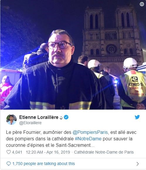 Ρίσκαρε τη ζωή του και μπήκε μέσα στις φλόγες που κατάπιναν την Παναγία των Παρισίων για να σώσει το Ακάνθινο Στεφάνι του Ιησού και άλλους ανεκτίμητους θησαυρούς. Ο λόγος για έναν ιερέα-ήρωα, τον πατέρα Φουρνιέ, ο οποίος αποτέλεσε μέρος της «ανθρώπινης αλυσίδας» που σχημάτισαν οι άνδρες των υπηρεσιών έκτακτης ανάγκης ώστε, με αυτοθυσία, να σώσουν από την πύρινη λαίλαπα τους θησαυρούς που βρίσκονταν μέσα στην Παναγία των Παρισίων, όπως αναφέρει η εφημερίδα Sun. Οι εκατομμύρια επισκέπτες που πηγαίνουν στη Notre Dame δεν έχουν επαφή με το στεφάνι, όμως, πρόκειται για ένα μοναδικό κειμήλιο. Έχει πάνω του περίπου 70 αγκάθια, περιβάλλεται από ένα χρυσό νήμα και βρίσκεται σε μια κρυστάλλινη λειψανοθήκη. Το ακάνθινο στεφάνι εκτίθεται μόνο τις Παρασκευές και κατά τη διάρκεια της Σαρακοστής, αλλά και τη Μεγάλη Παρασκευή.