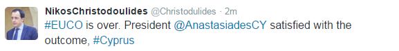 “O πρόεδρος Αναστασιάδης είναι ικανοποιημένος με το αποτέλεσμα” σημείωσε μέσω του λογαριασμού του στο twitter o κυβερνητικός εκπρόσωπος της Κύπρου, Νίκος Χριστοδουλίδης.