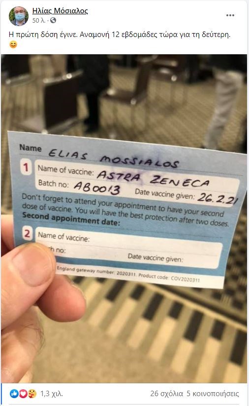 Την πρώτη δόση του εμβολίου της AstraZeneca έκανε την Παρασκευή ο καθηγητής του LSE, Ηλίας Μόσιαλος, ο οποίος, μάλιστα, ανήρτησε και φωτογραφία στο προφίλ του στο Facebook.